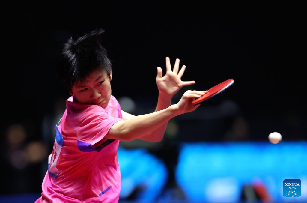 Sun Yingsha competes during the table tennis women's singles round of 16 match between Sun Yingsha of Hebei and Wang Xiaotong of Shandong at China's 15th National Games in Macao, south China, Nov. 12, 2025. (Xinhua/Liu Xu)