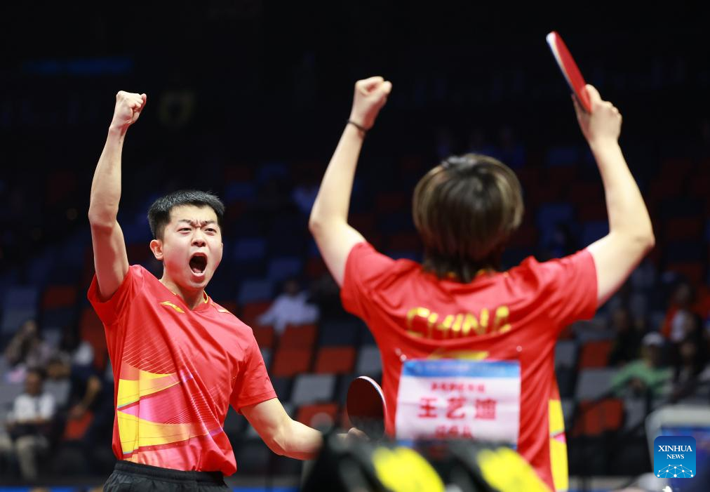 Yuan Licen/Wang Yidi (R) celebrate scoring during the table tennis mixed doubles semifinal match between Lin Gaoyuan/Liu Shiwen of Guangdong and Yuan Licen/Wang Yidi of Liaoning at China's 15th National Games in Macao, south China, Nov. 13, 2025. (Xinhua/Liu Xu)