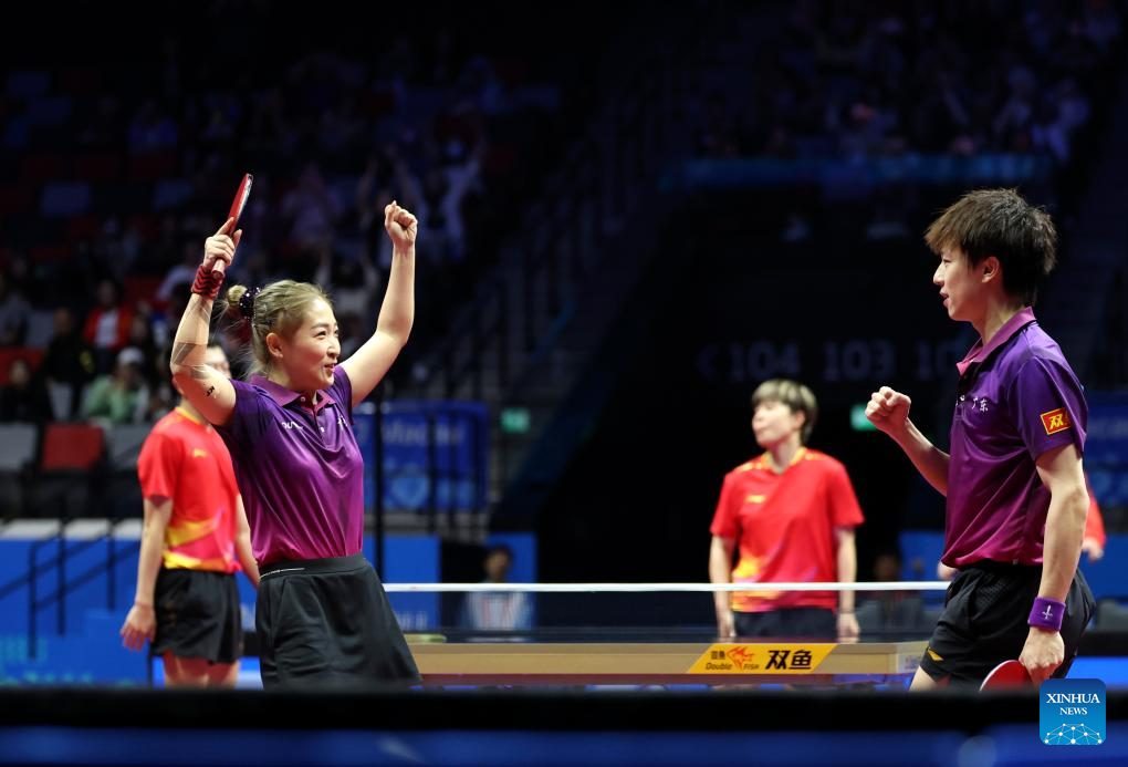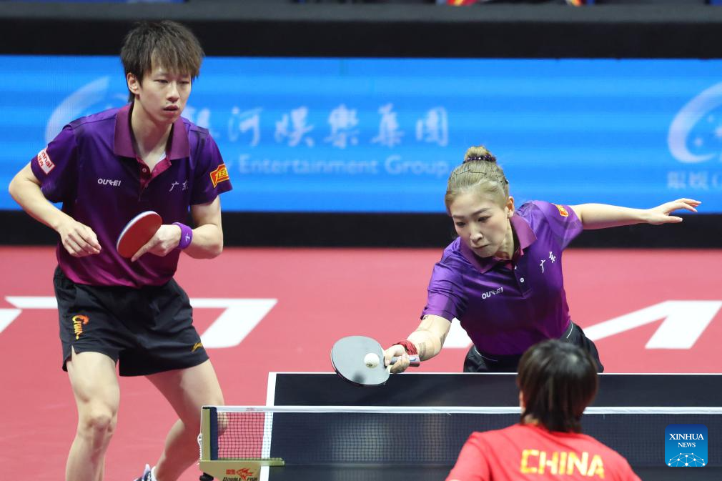 Yuan Licen/Wang Yidi (R) compete during the table tennis mixed doubles semifinal match between Lin Gaoyuan/Liu Shiwen of Guangdong and Yuan Licen/Wang Yidi of Liaoning at China's 15th National Games in Macao, south China, Nov. 13, 2025. (Xinhua/Chen Bin)