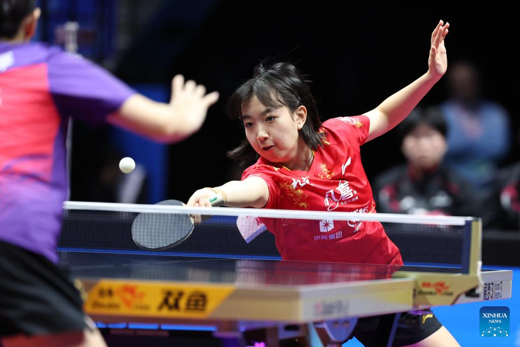 Yang Huize of Beijing competes in the match against Wang Xinya of Shandong during U18 women's team final match of table tennis between Beijing and Shandong at China's 15th National Games in Macao, south China, Nov. 13, 2025. (Xinhua/Chen Bin)