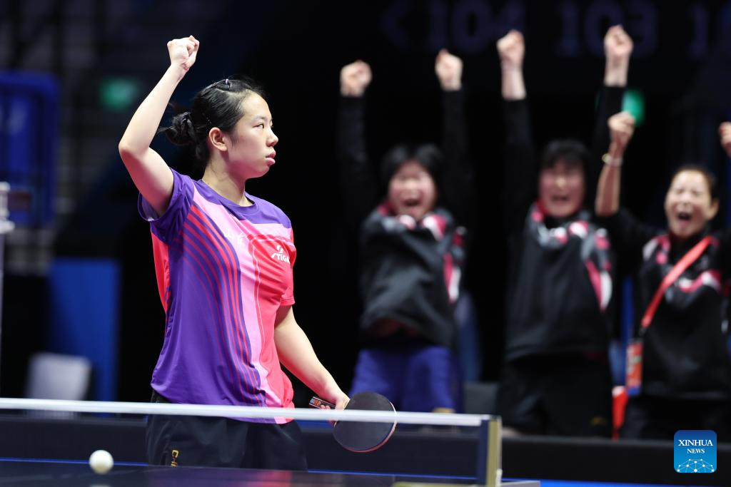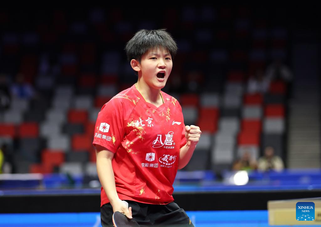 Zhu Qihui of Beijing celebrates in the match against Ding Yijie of Shandong during U18 women's team final match of table tennis between Beijing and Shandong at China's 15th National Games in Macao, south China, Nov. 13, 2025. (Xinhua/Liang Xu)