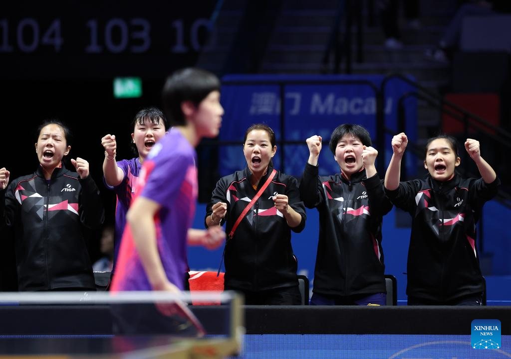 Members of team Shandong cheer during U18 women's team final match of table tennis between Beijing and Shandong at China's 15th National Games in Macao, south China, Nov. 13, 2025. (Xinhua/Chen Bin)