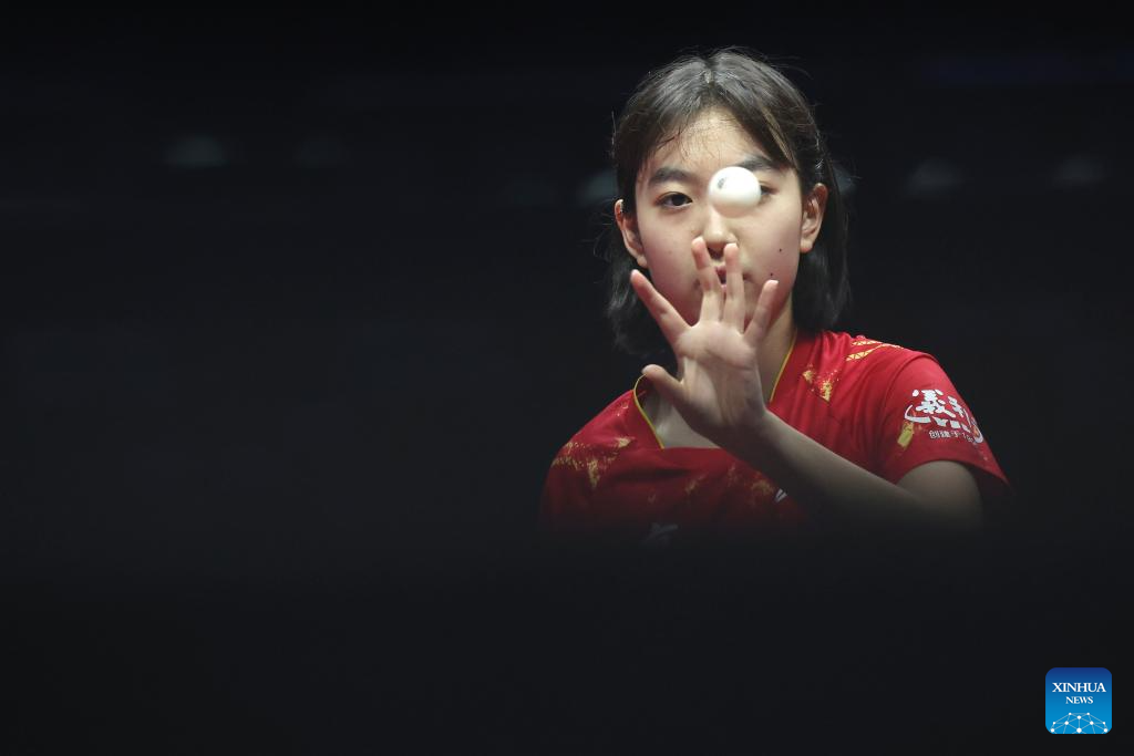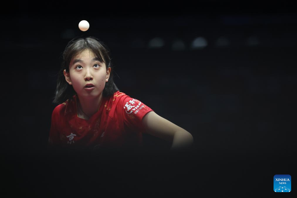 Chen Xingtong serves during the table tennis women's singles quarterfinal match between Zhu Yuling of Macao and Chen Xingtong of Liaoning at China's 15th National Games in Macao, south China, Nov. 13, 2025. (Xinhua/Liang Xu)