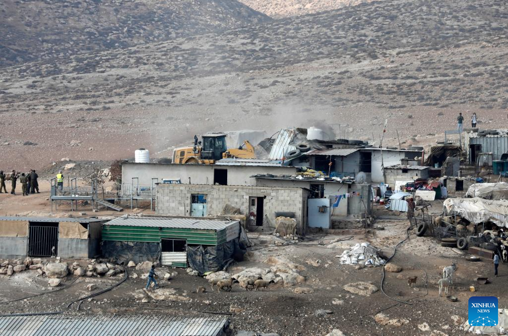 An Israeli bulldozer demolishes Palestinian houses and tents in Masafer Yatta, southern West Bank city of Hebron, Nov. 12, 2025. (Photo by Mamoun Wazwaz/Xinhua)