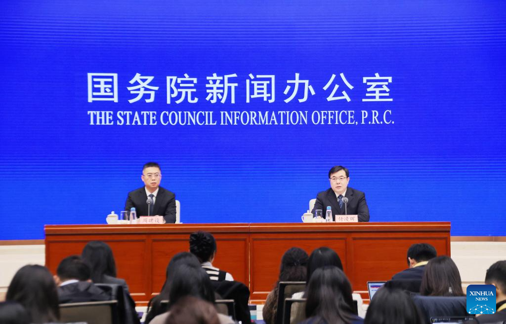 Fu Linghui (R), spokesperson and chief economist of the National Bureau of Statistics (NBS) and director general of the Department of Comprehensive Statistics of the NBS, attends a press conference held by the State Council Information Office (SCIO) on China's economic performance of October 2025, in Beijing, capital of China, Nov. 14, 2025. (Xinhua/Pan Xu)