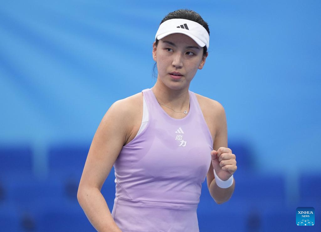 Wang Xinyu of Guangdong celebrates scoring during the women's singles first round match of tennis between Wang Xinyu of Guangdong and Wang Yuping of Fujian at China's 15th National Games in Hengqin, south China's Guangdong Province, Nov. 14, 2025. (Xinhua/Yan Linyun)