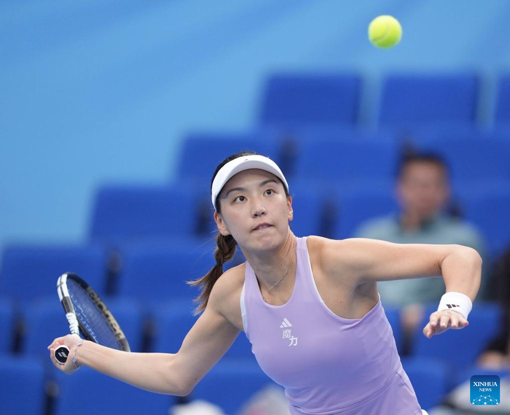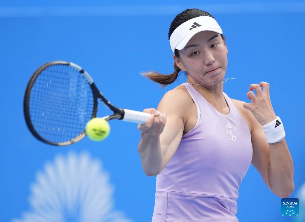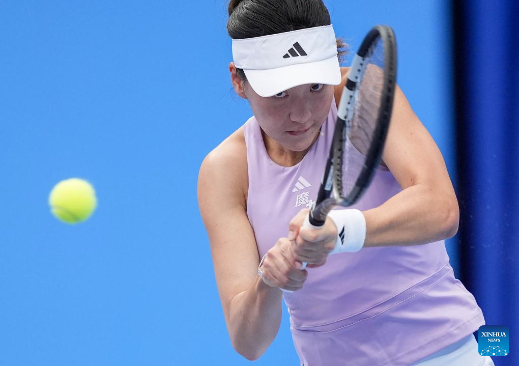 Wang Xinyu of Guangdong hits a return during the women's singles first round match of tennis between Wang Xinyu of Guangdong and Wang Yuping of Fujian at China's 15th National Games in Hengqin, south China's Guangdong Province, Nov. 14, 2025. (Xinhua/Yan Linyun)