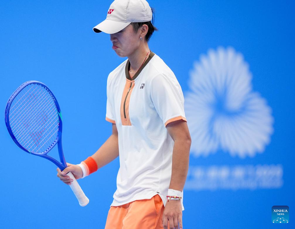 Wang Yuping of Fujian reacts during the women's singles first round match of tennis between Wang Xinyu of Guangdong and Wang Yuping of Fujian at China's 15th National Games in Hengqin, south China's Guangdong Province, Nov. 14, 2025. (Xinhua/Yan Linyun)