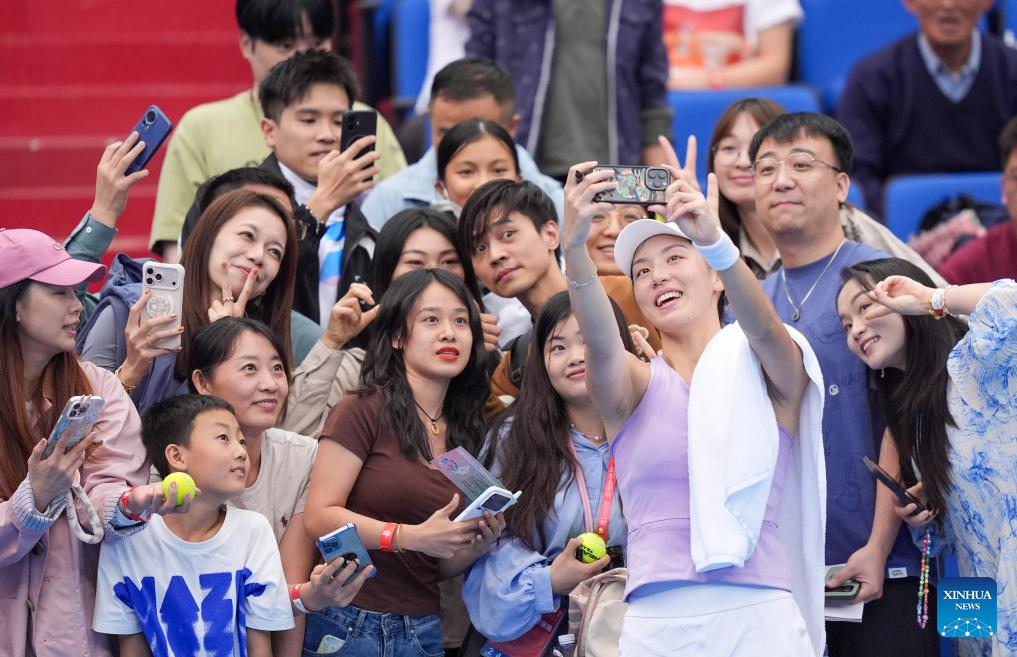 Wang Xinyu (front) of Guangdong takes selfies with fans after the women's singles first round match of tennis between Wang Xinyu of Guangdong and Wang Yuping of Fujian at China's 15th National Games in Hengqin, south China's Guangdong Province, Nov. 14, 2025. (Xinhua/Yan Linyun)