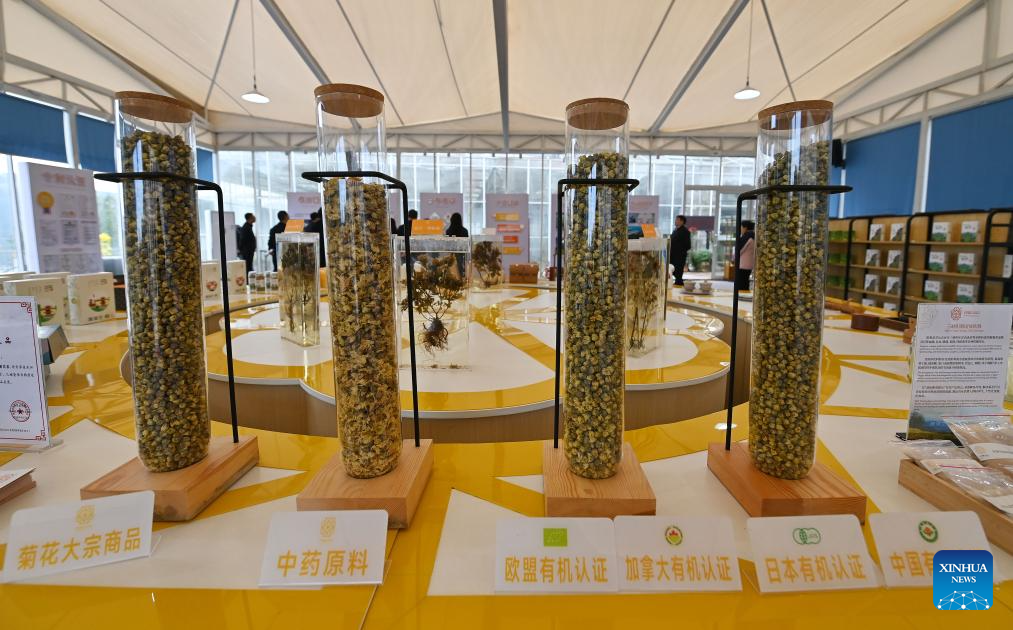This photo shows products of the Three Gorges Yang Ju chrysanthemum brand at its ecological park in Yunyang County, southwest China's Chongqing, Nov. 5, 2025. (Xinhua/Xiao Xiao)