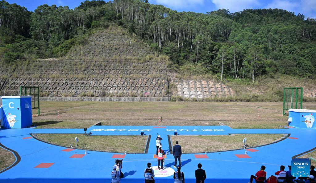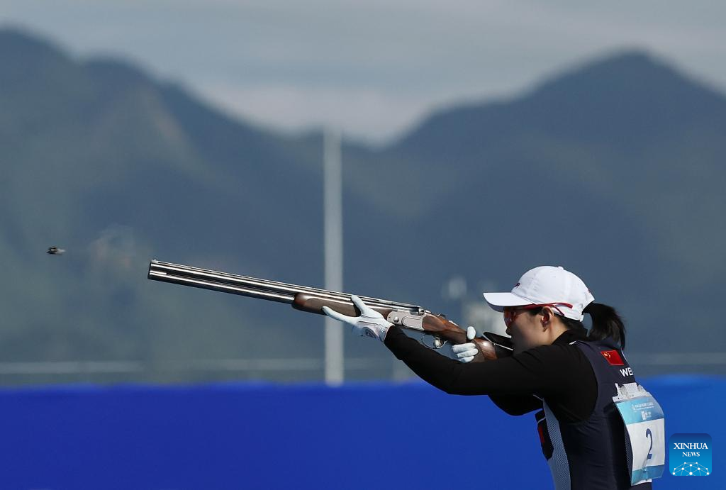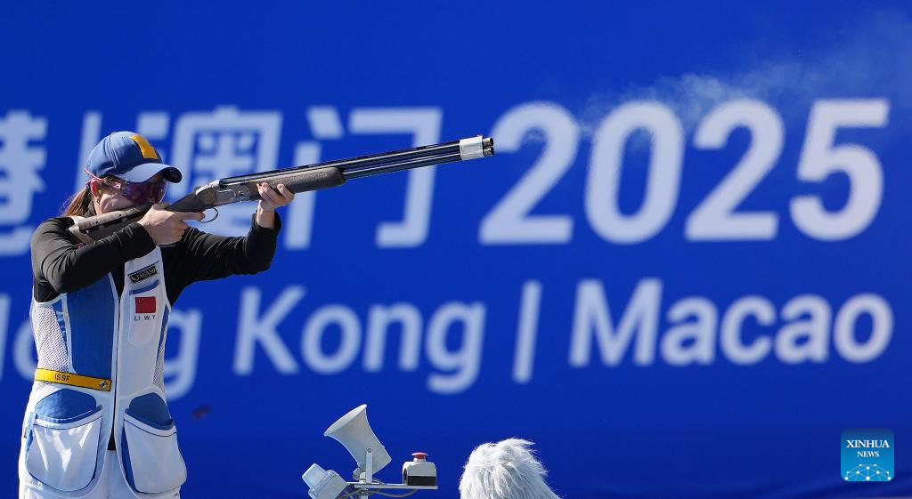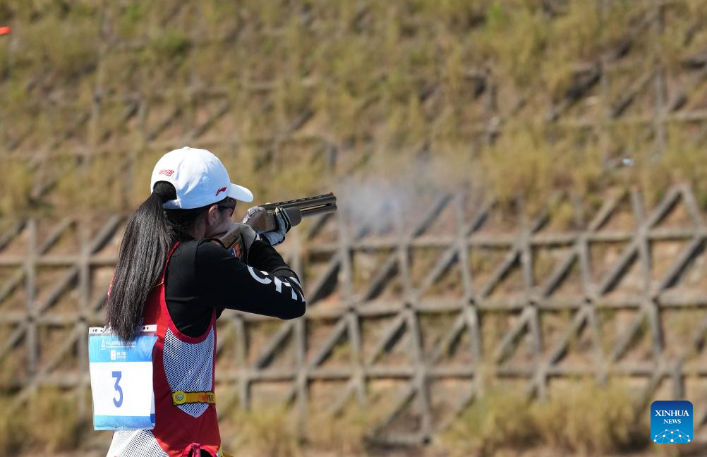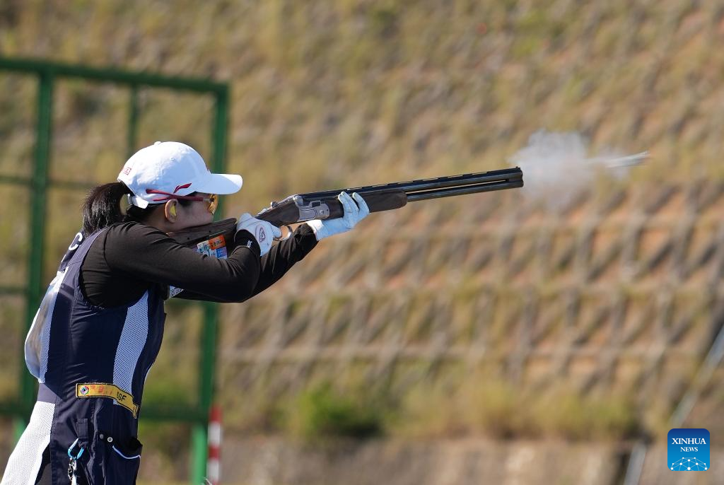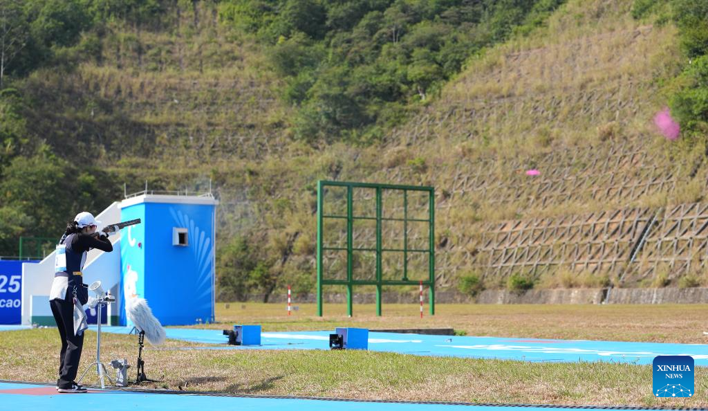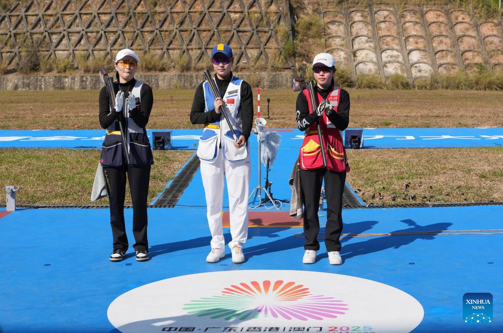Athletes compete during the skeet women's final of shooting at China's 15th National Games in Guangzhou, south China's Guangdong Province, Nov. 14, 2025. (Xinhua/Xiao Ennan)