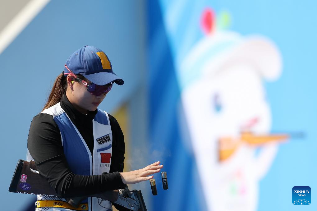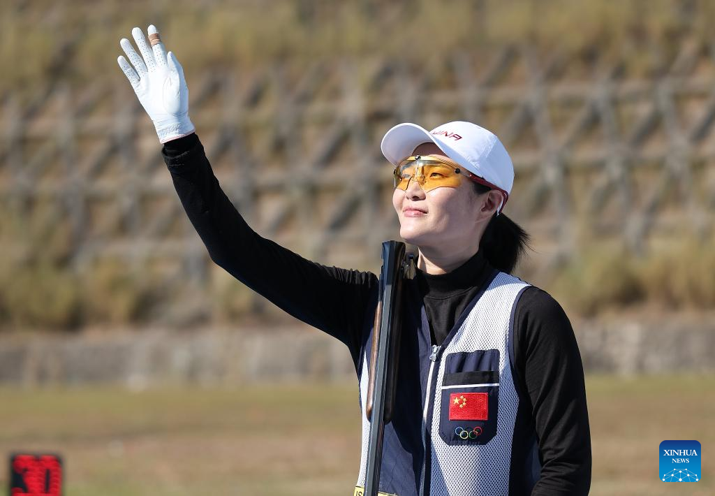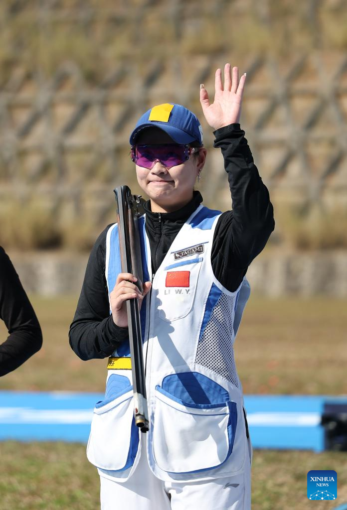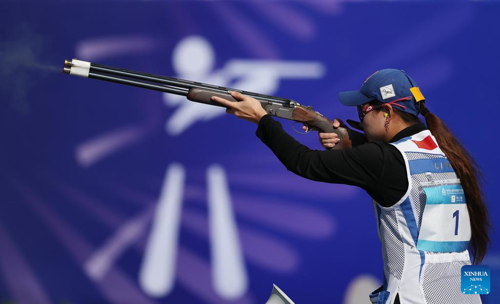 Li Wenyi of Jiangsu competes during the skeet women's final of shooting at China's 15th National Games in Guangzhou, south China's Guangdong Province, Nov. 14, 2025. (Xinhua/Xiao Ennan)