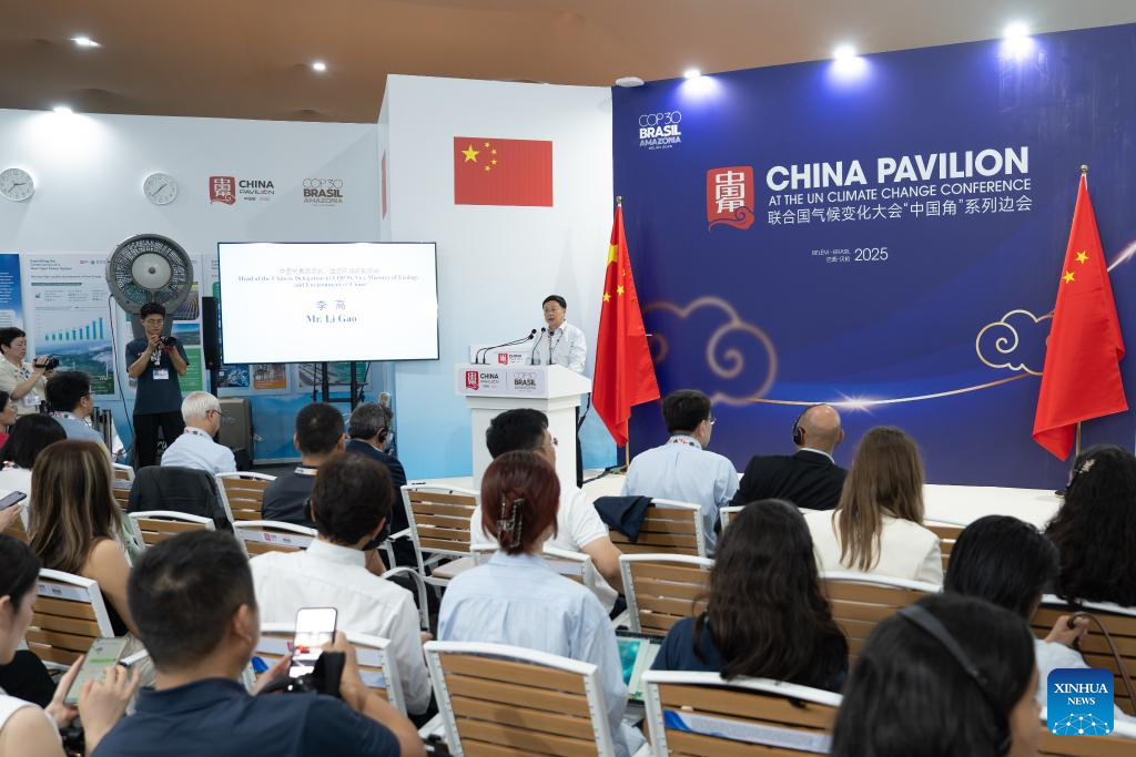 Li Gao, head of the Chinese delegation and vice minister of ecology and environment, speaks at a high-level side event during the COP30 in Belem, Brazil, Nov. 12, 2025. A high-level side event on innovation and green development was held here on Wednesday during the COP30 to share expertise and experience in green transition. Representatives from UN agencies, international organizations, governments, and financial and research institutions attended the event. (Xinhua/Wang Tiancong)