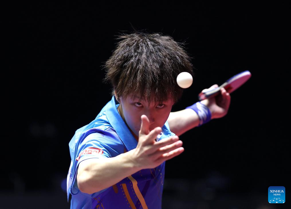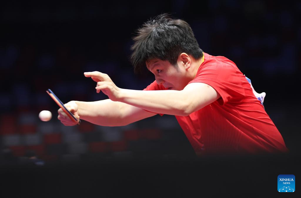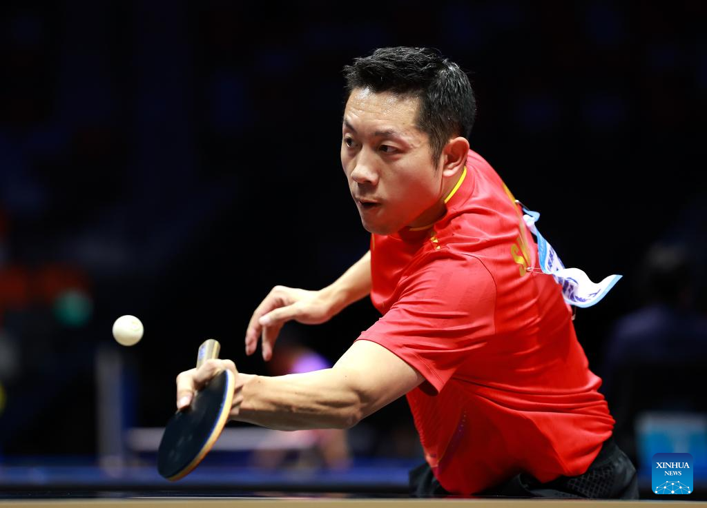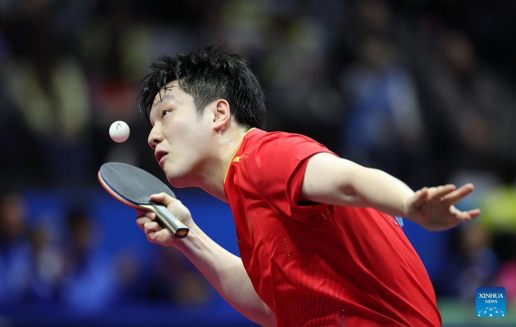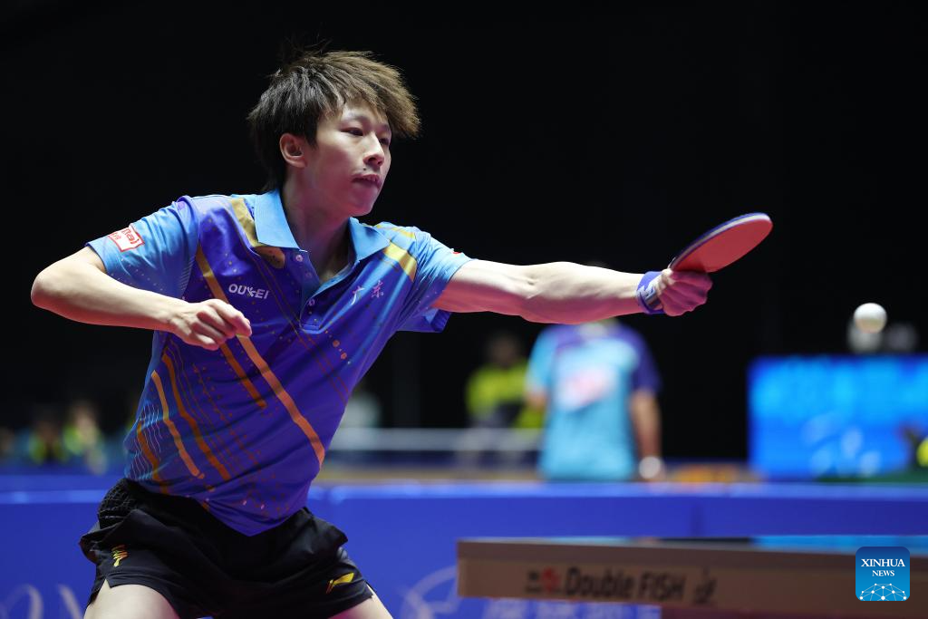 Fan Zhengdong of Shanghai returns a ball in the match against Sun Wen of Jiangsu during the men's team group A match of table tennis between Shanghai and Jiangsu at China's 15th National Games in Macao, south China, Nov. 14, 2025. (Xinhua/Liang Xu)