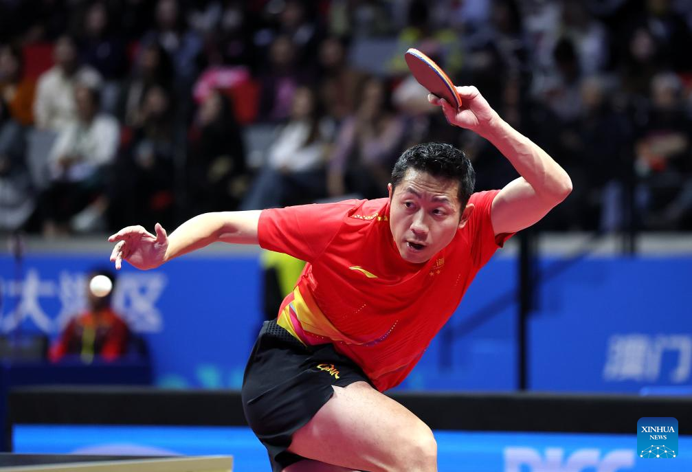 Lin Gaoyuan of Guangdong competes against Cai Wei of Zhejiang during the men's team group C match of table tennis between Guangdong and Zhejiang at China's 15th National Games in Macao, south China, Nov. 14, 2025. (Xinhua/Sun Fanyue)