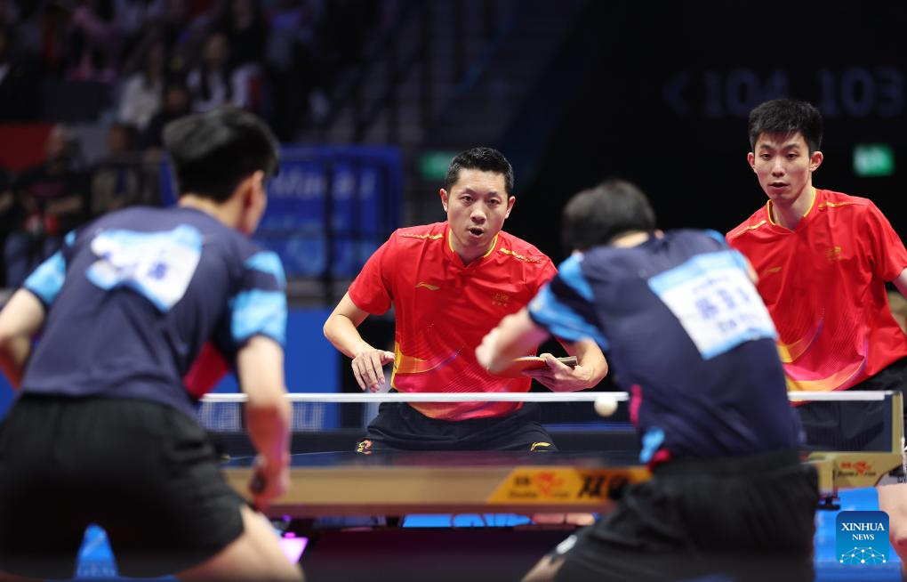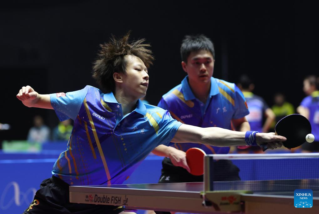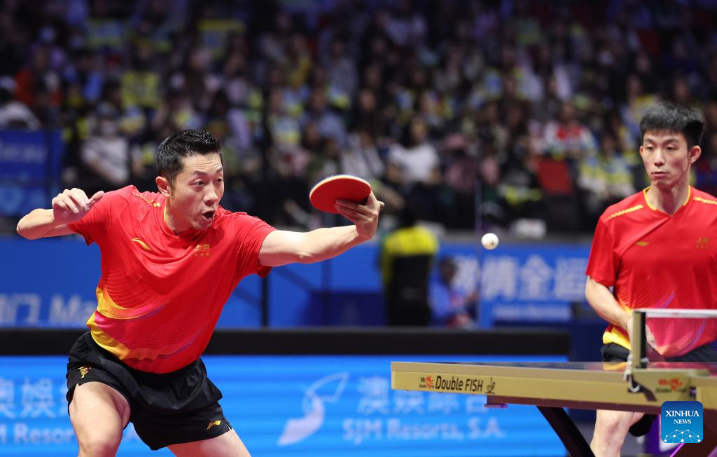 Xu Xin (L)/Zhou Kai of Shanghai compete against Cao Yantao/Chen Yaxuan of Jiangsu during the men's team group A match of table tennis between Shanghai and Jiangsu at China's 15th National Games in Macao, south China, Nov. 14, 2025. (Xinhua/Liang Xu)