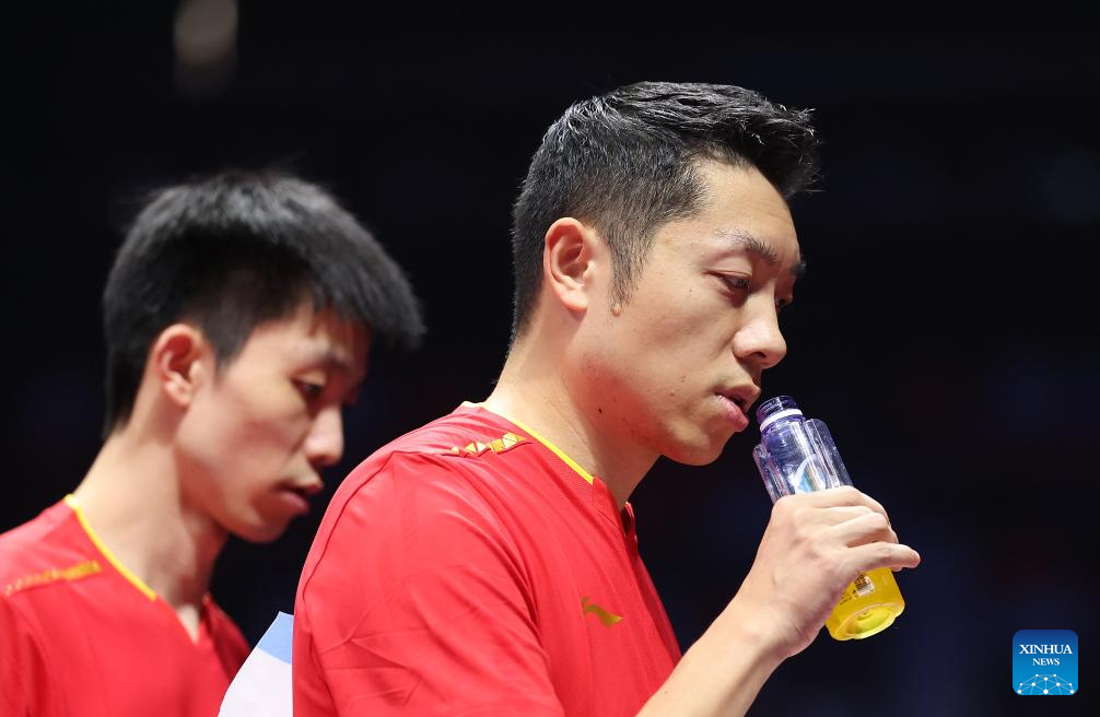 Lin Gaoyuan/Liu Shiwen (L) talk to each other during the mixed doubles final of table tennis between Chen Yuanyu/Kuai Man of Jiangsu and Lin Gaoyuan/Liu Shiwen of Guangdong at China's 15th National Games in Macao, south China, Nov. 14, 2025. (Xinhua/Liu Xu)