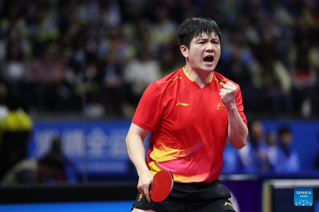 Fan Zhendong of Shanghai celebrates scoring in a match against Sun Wen of Jiangsu during the men's team group A match of table tennis between Shanghai and Jiangsu at China's 15th National Games in Macao, south China, Nov. 14, 2025. (Xinhua/Sun Fanyue)