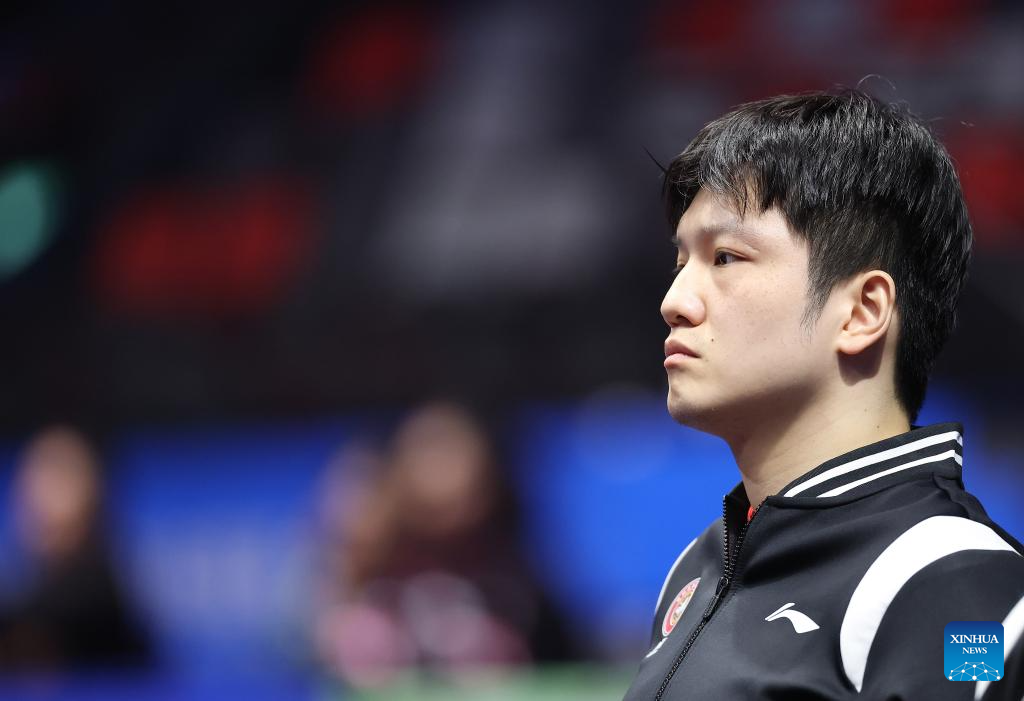 Fan Zhendong of Shanghai reacts in a match against Sun Wen of Jiangsu during the men's team group A match of table tennis between Shanghai and Jiangsu at China's 15th National Games in Macao, south China, Nov. 14, 2025. (Xinhua/Liang Xu)