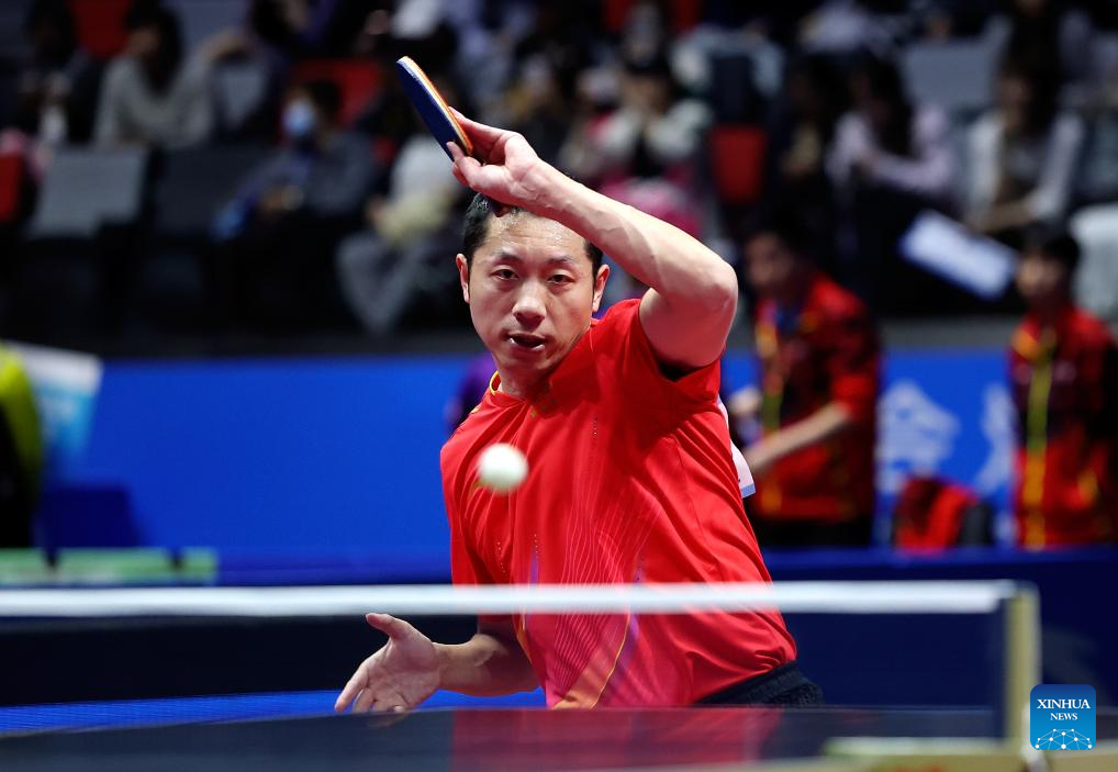 Xu Xin of Shanghai returns a ball in the match against Chen Yaxuan of Jiangsu during the men's team group A match of table tennis between Shanghai and Jiangsu at China's 15th National Games in Macao, south China, Nov. 14, 2025. (Xinhua/Liang Xu)