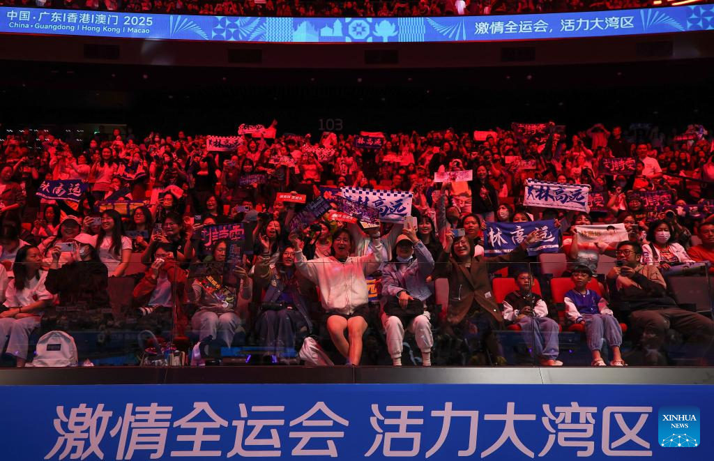 Spectators cheer during the mixed doubles final of table tennis between Chen Yuanyu/Kuai Man of Jiangsu and Lin Gaoyuan/Liu Shiwen of Guangdong at China's 15th National Games in Macao, south China, Nov. 14, 2025. (Xinhua/Sun Fanyue)