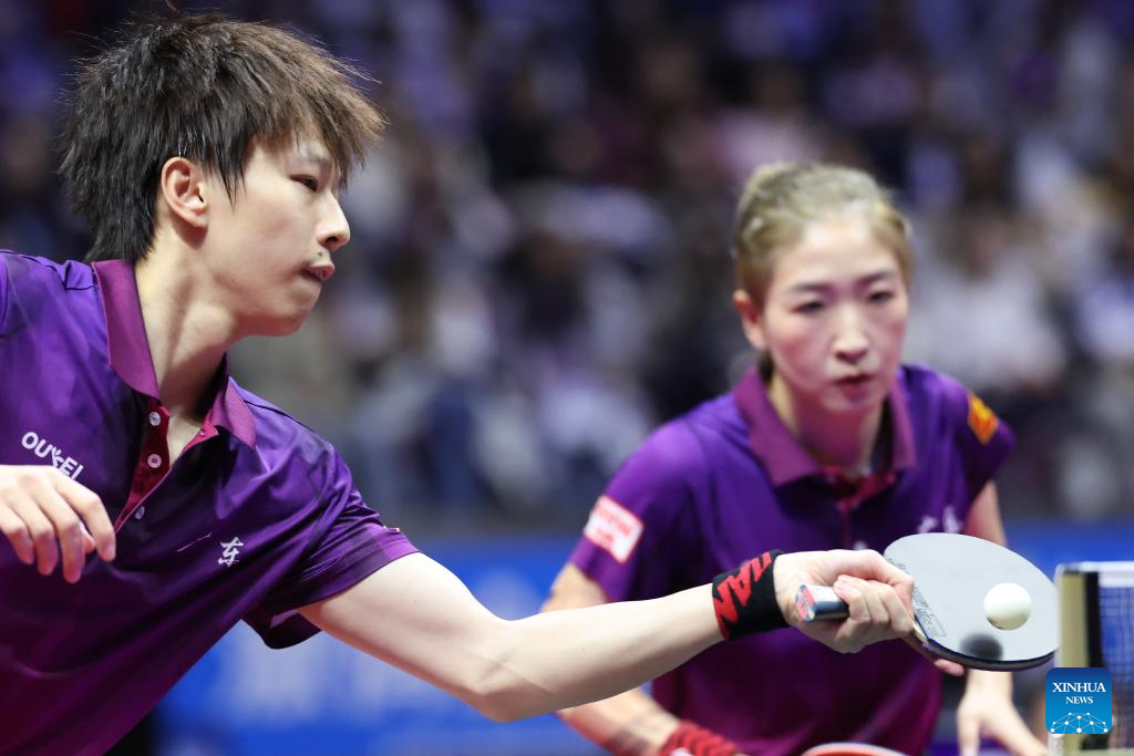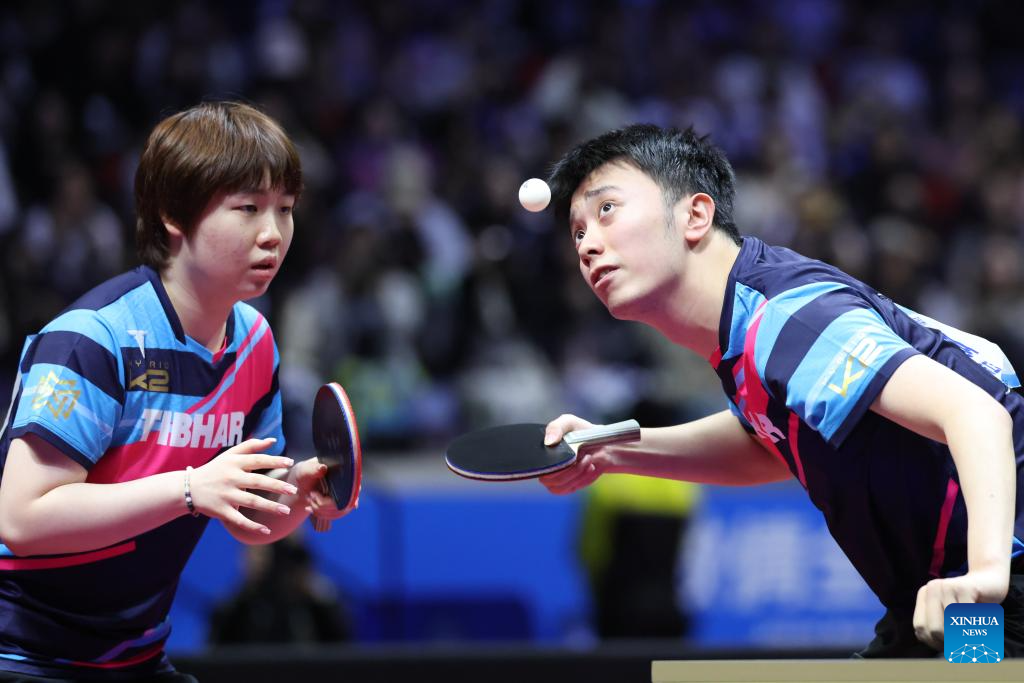 Chen Yuanyu/Kuai Man (front) compete during the mixed doubles final of table tennis between Chen Yuanyu/Kuai Man of Jiangsu and Lin Gaoyuan/Liu Shiwen of Guangdong at China's 15th National Games in Macao, south China, Nov. 14, 2025. (Xinhua/Liu Xu)