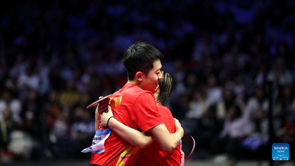 Lin Gaoyuan/Liu Shiwen (R) hug during the mixed doubles final of table tennis between Chen Yuanyu/Kuai Man of Jiangsu and Lin Gaoyuan/Liu Shiwen of Guangdong at China's 15th National Games in Macao, south China, Nov. 14, 2025. (Xinhua/Liu Xu)