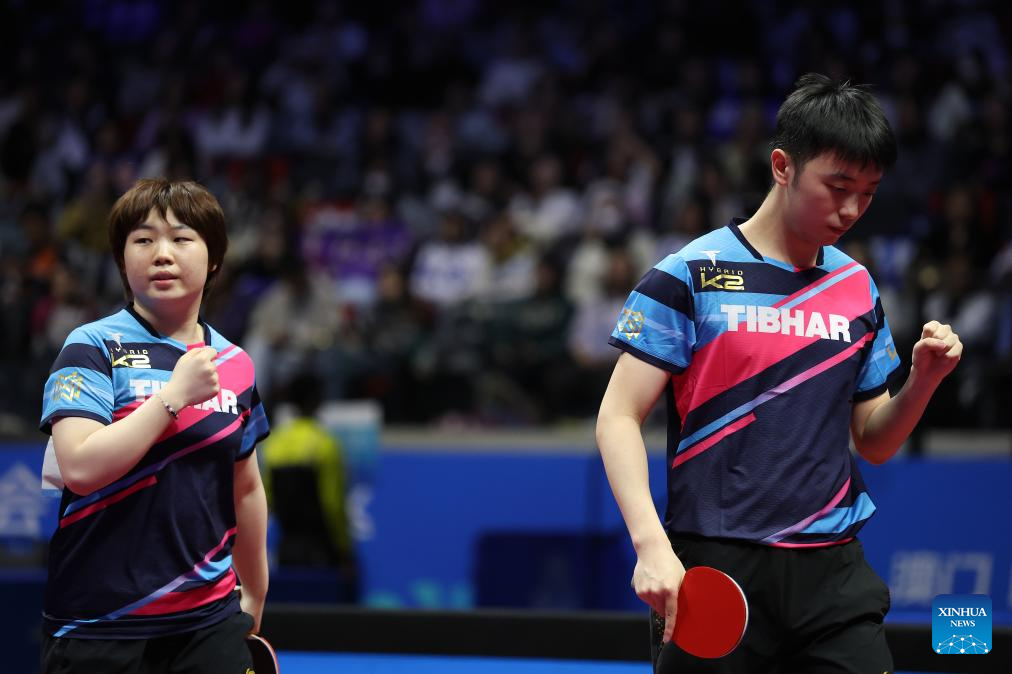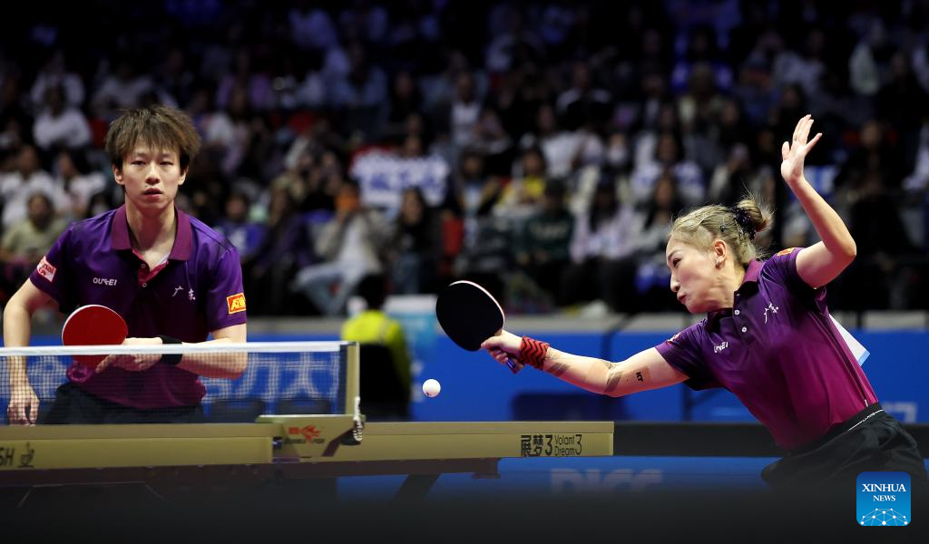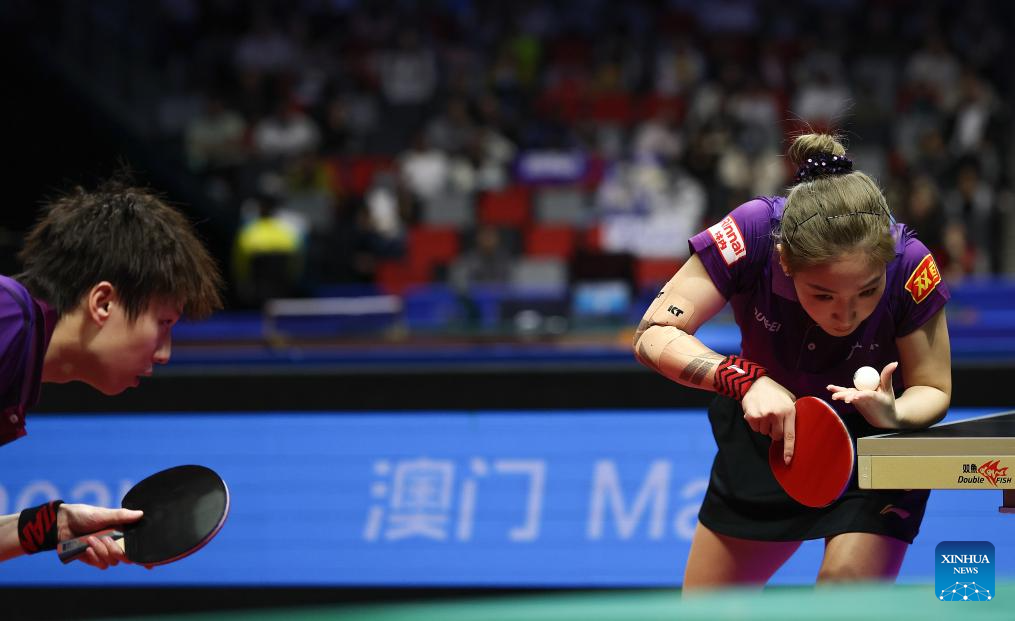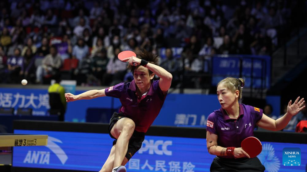 Chen Yuanyu (R)/Kuai Man compete during the mixed doubles final of table tennis between Chen Yuanyu/Kuai Man of Jiangsu and Lin Gaoyuan/Liu Shiwen of Guangdong at China's 15th National Games in Macao, south China, Nov. 14, 2025. (Xinhua/Sun Fanyue)