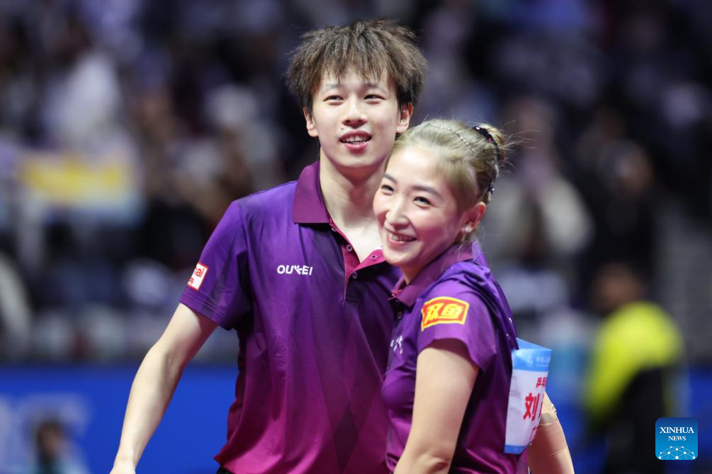 Lin Gaoyuan (L)/Liu Shiwen celebrate winning the mixed doubles final of table tennis between Chen Yuanyu/Kuai Man of Jiangsu and Lin Gaoyuan/Liu Shiwen of Guangdong at China's 15th National Games in Macao, south China, Nov. 14, 2025. (Xinhua/Liu Xu)
