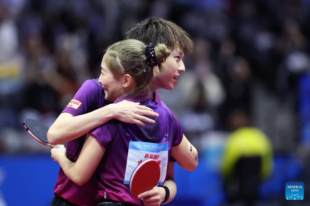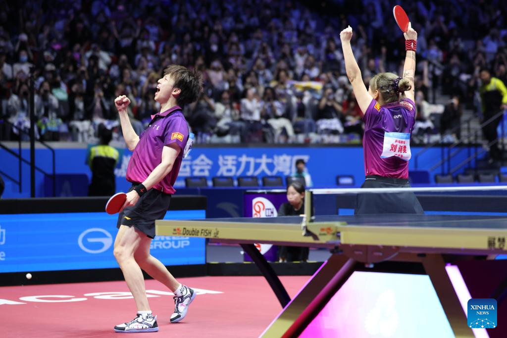 Chen Yuanyu/Kuai Man (L) celebrate scoring during the mixed doubles final of table tennis between Chen Yuanyu/Kuai Man of Jiangsu and Lin Gaoyuan/Liu Shiwen of Guangdong at China's 15th National Games in Macao, south China, Nov. 14, 2025. (Xinhua/Sun Fanyue)