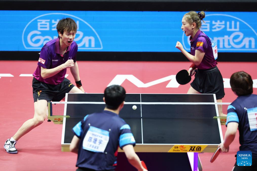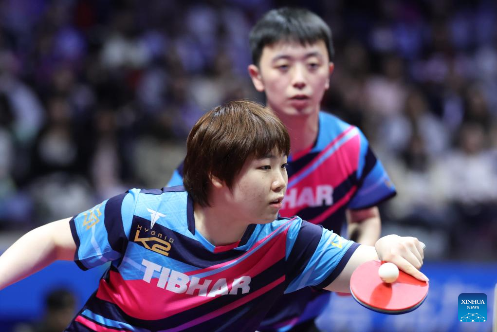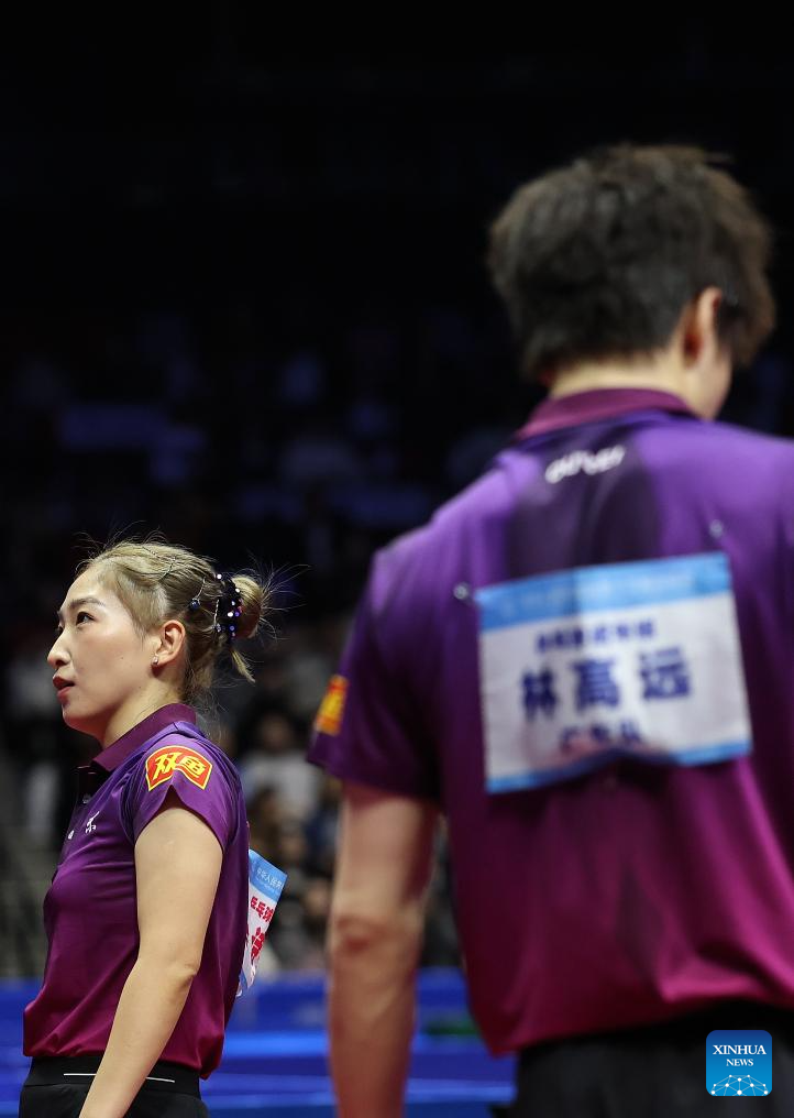 Chen Yuanyu (R)/Kuai Man compete during the mixed doubles final of table tennis between Chen Yuanyu/Kuai Man of Jiangsu and Lin Gaoyuan/Liu Shiwen of Guangdong at China's 15th National Games in Macao, south China, Nov. 14, 2025. (Xinhua/Liu Xu)