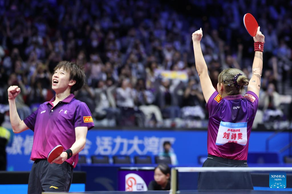 Lin Gaoyuan (top L)/Liu Shiwen (top R) celebrate scoring during the mixed doubles final of table tennis between Chen Yuanyu/Kuai Man of Jiangsu and Lin Gaoyuan/Liu Shiwen of Guangdong at China's 15th National Games in Macao, south China, Nov. 14, 2025. (Xinhua/Liang Xu)