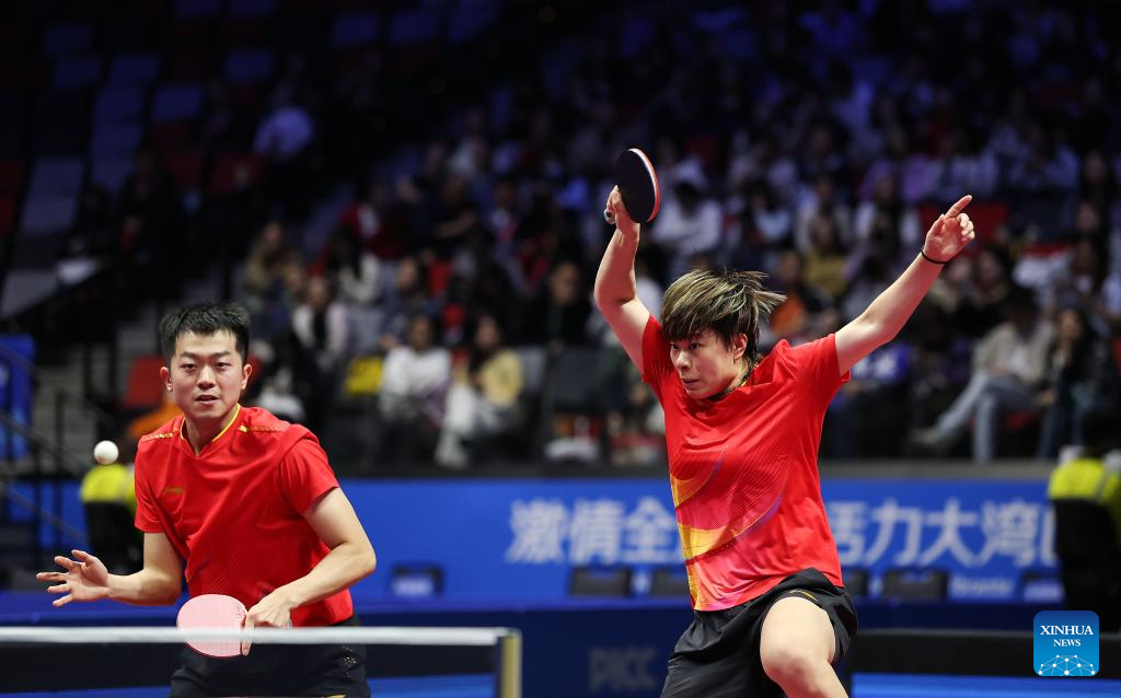 Lin Gaoyuan (L)/Liu Shiwen compete during the mixed doubles final of table tennis between Chen Yuanyu/Kuai Man of Jiangsu and Lin Gaoyuan/Liu Shiwen of Guangdong at China's 15th National Games in Macao, south China, Nov. 14, 2025. (Xinhua/Sun Fanyue)