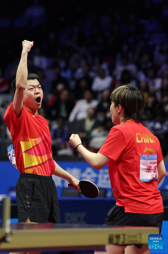 Chen Yuanyu (R)/Kuai Man celebrate scoring during the mixed doubles final of table tennis between Chen Yuanyu/Kuai Man of Jiangsu and Lin Gaoyuan/Liu Shiwen of Guangdong at China's 15th National Games in Macao, south China, Nov. 14, 2025. (Xinhua/Liu Xu)