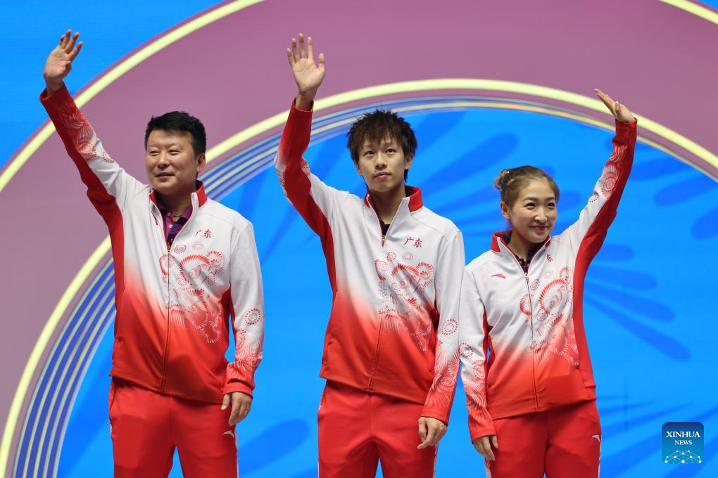 Gold medalists Lin Gaoyuan/Liu Shiwen of Guangdong and their coach greet the spectators during the awarding ceremony for the table tennis mixed doubles at China's 15th National Games in Macao, south China, Nov. 14, 2025. (Xinhua/Liu Xu)