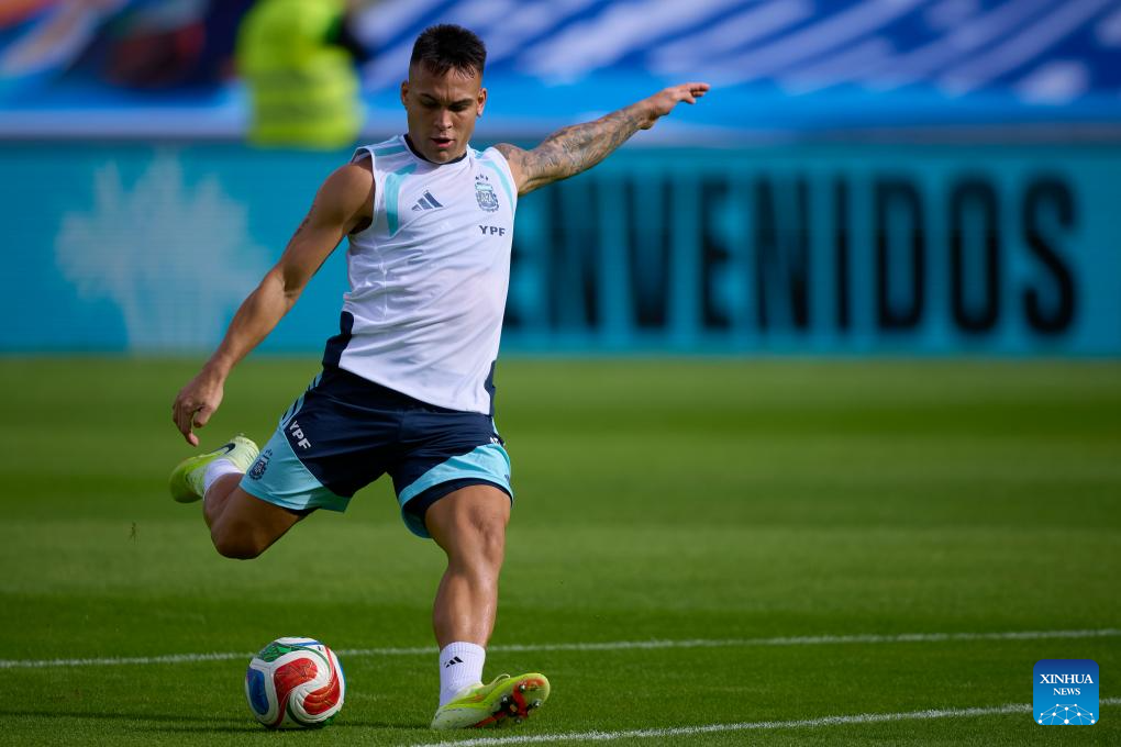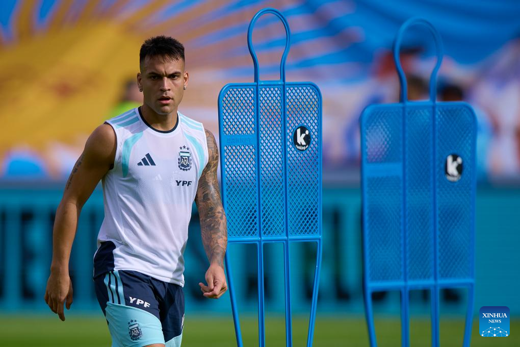 Lautaro Martinez of the Argentina national football team attends a training session at Martinez Valero Stadium in Elche, Spain, on Nov. 13, 2025. (Str/Xinhua)