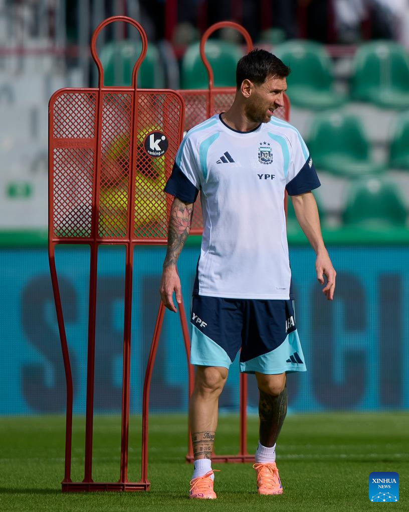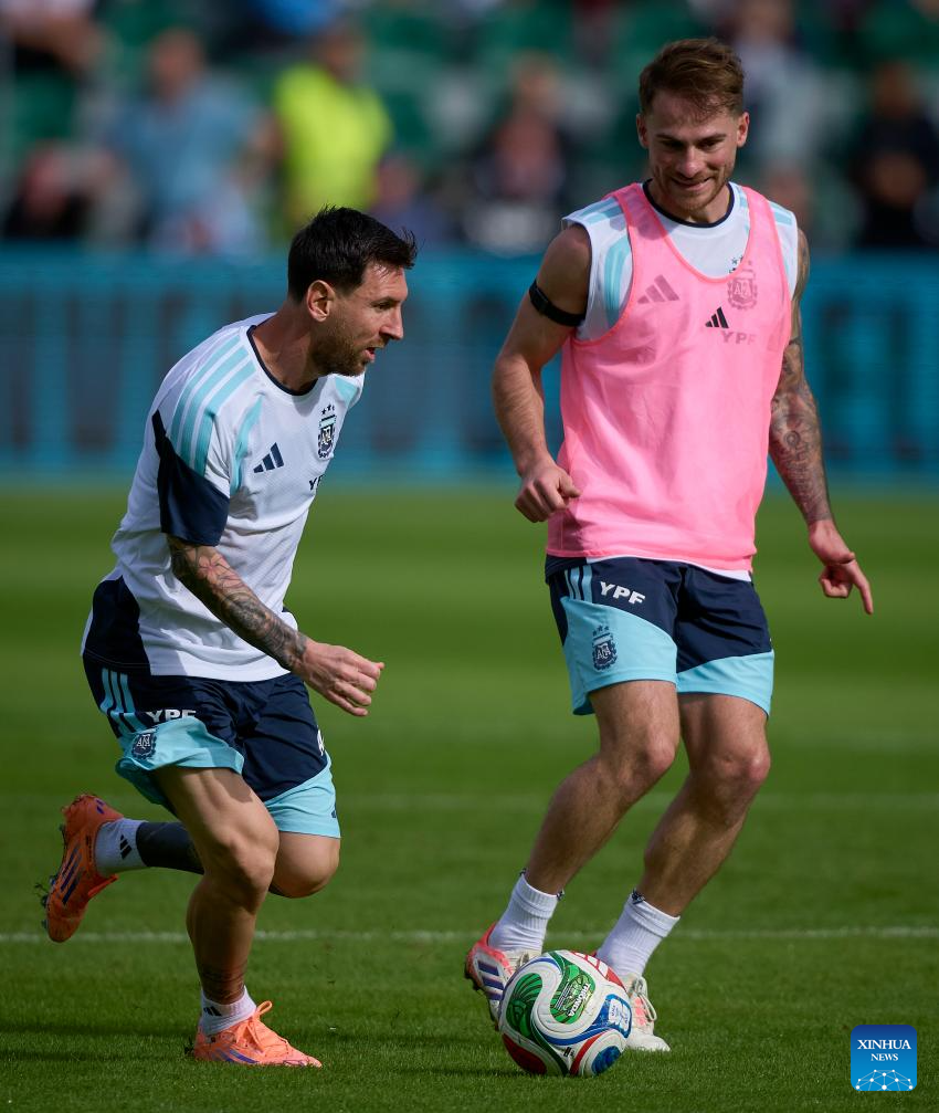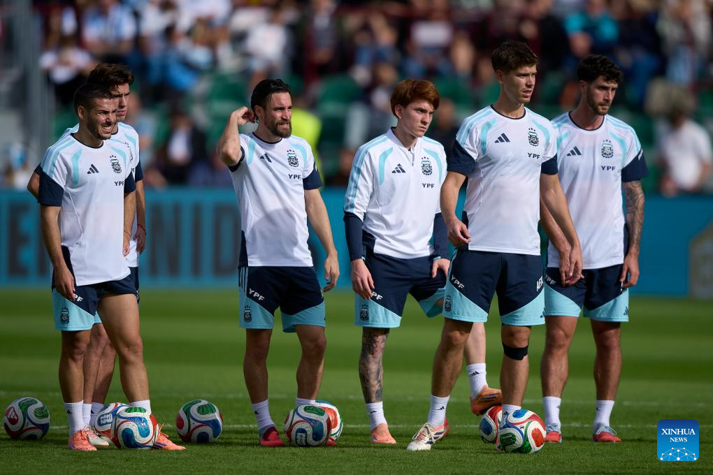 Players of the Argentina national football team attend a training session at Martinez Valero Stadium in Elche, Spain, on Nov. 13, 2025. (Str/Xinhua)