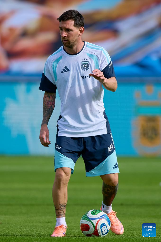Lionel Messi of the Argentina national football team attends a training session at Martinez Valero Stadium in Elche, Spain, on Nov. 13, 2025. (Str/Xinhua)