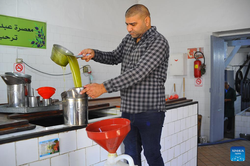 A worker produces olive oil with traditional methods at an olive oil workshop in Tebourba, Tunisia, Nov. 13, 2025. Tunisia is one of the world's major producers and exporters of olive oil. (Photo by Adel Ezzine/Xinhua)