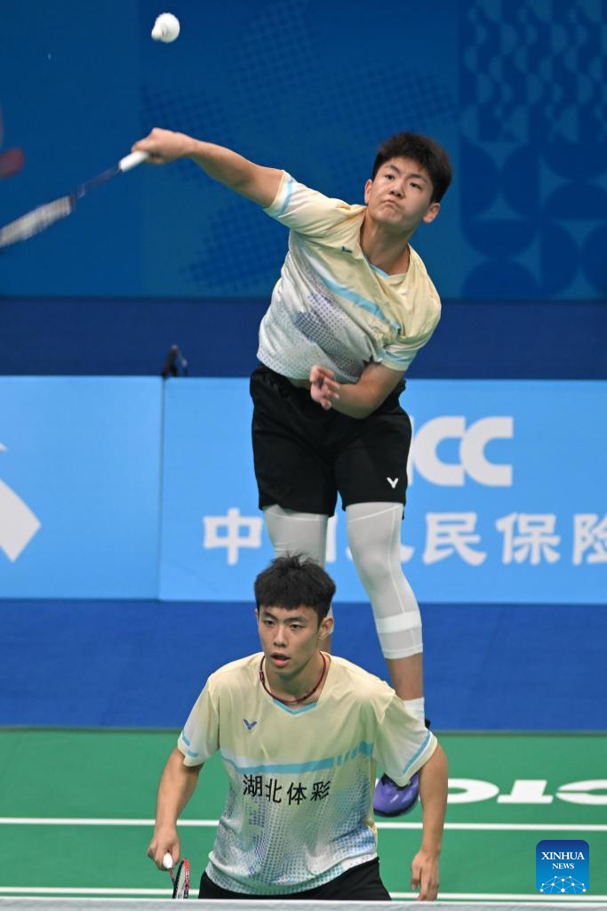 Tu Yichen/Zheng Weigang of Hubei compete against Xu Huayu/Xue Ziyu of Shandong during the U18 men's team final of badminton between Shandong and Hebei at China's 15th National Games in Shenzhen, south China's Guangdong Province, Nov. 13, 2025. (Xinhua/Zhang Long)
