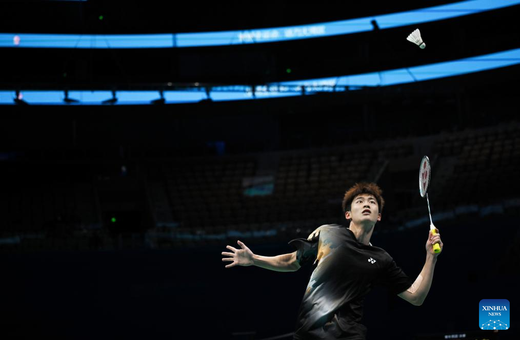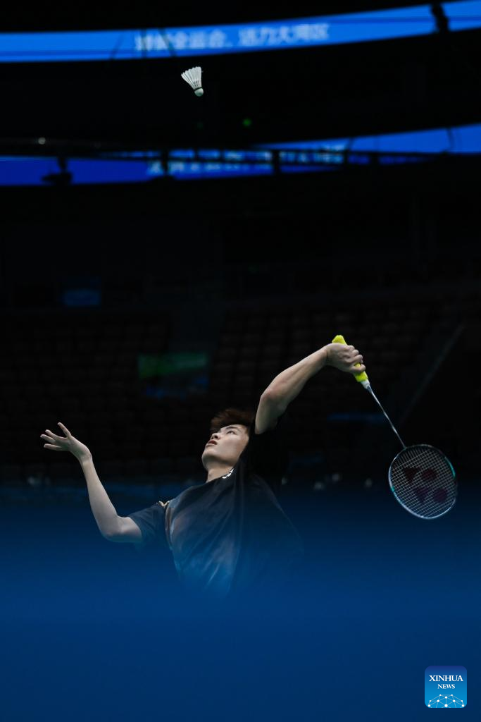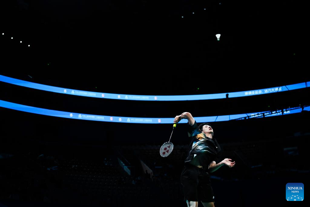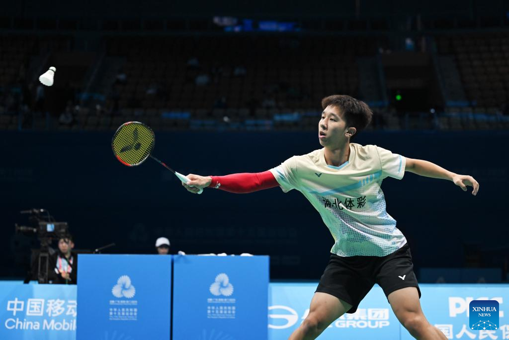Wang Zijun of Hubei competes against Xiao Gaobo of Shandong during the U18 men's team final of badminton between Shandong and Hebei at China's 15th National Games in Shenzhen, south China's Guangdong Province, Nov. 13, 2025. (Xinhua/Zhang Long)