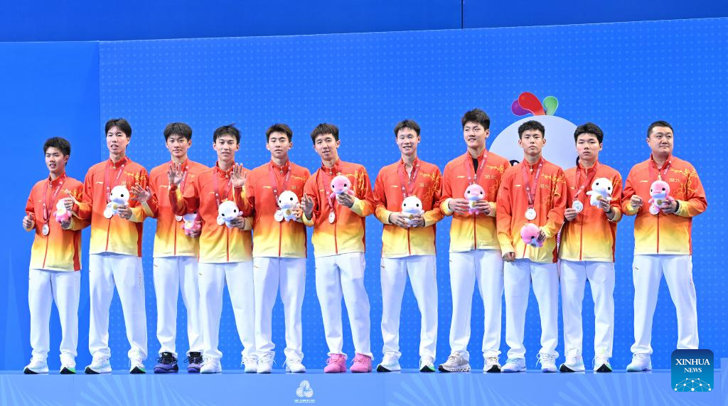 Silver medalists team Hubei pose during the awarding ceremony for the U18 men's team of badminton at China's 15th National Games in Shenzhen, south China's Guangdong Province, Nov. 13, 2025. (Xinhua/Li He)