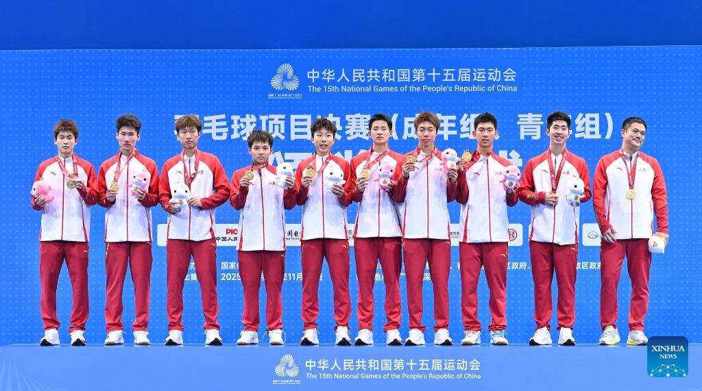 Gold medalists team Shandong pose during the awarding ceremony for the U18 men's team of badminton at China's 15th National Games in Shenzhen, south China's Guangdong Province, Nov. 13, 2025. (Xinhua/Li He)