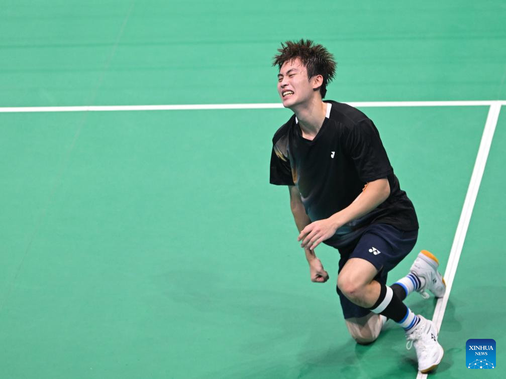Xiao Gaobo of Shandong reacts while competing against Wang Zijun of Hubei during the U18 men's team final of badminton between Shandong and Hebei at China's 15th National Games in Shenzhen, south China's Guangdong Province, Nov. 13, 2025. (Xinhua/Zhang Long)