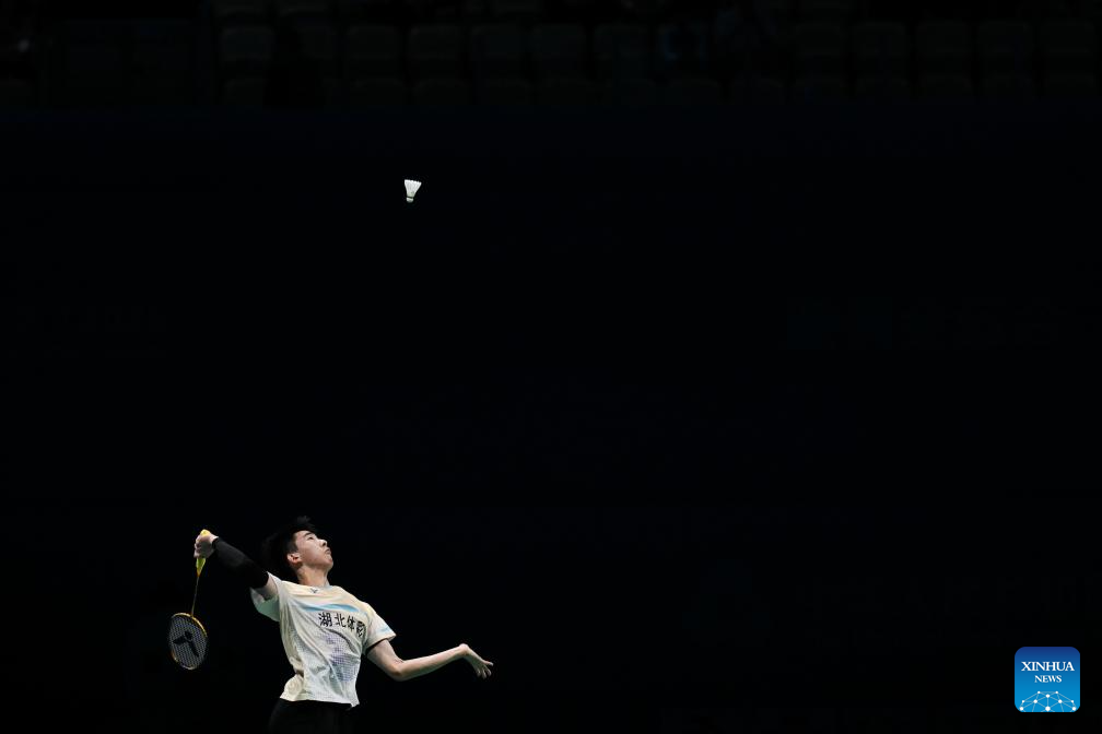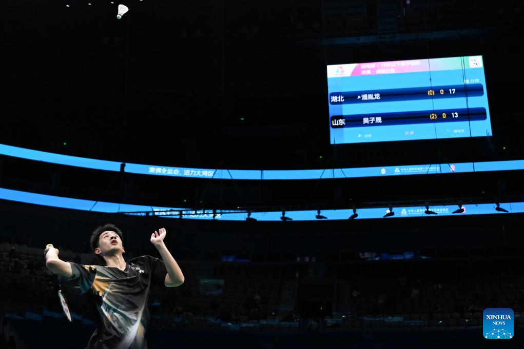 Pan Yinlong of Hubei competes against Wu Zisheng of Shandong during the U18 men's team final of badminton between Shandong and Hebei at China's 15th National Games in Shenzhen, south China's Guangdong Province, Nov. 13, 2025. (Xinhua/Zhang Long)