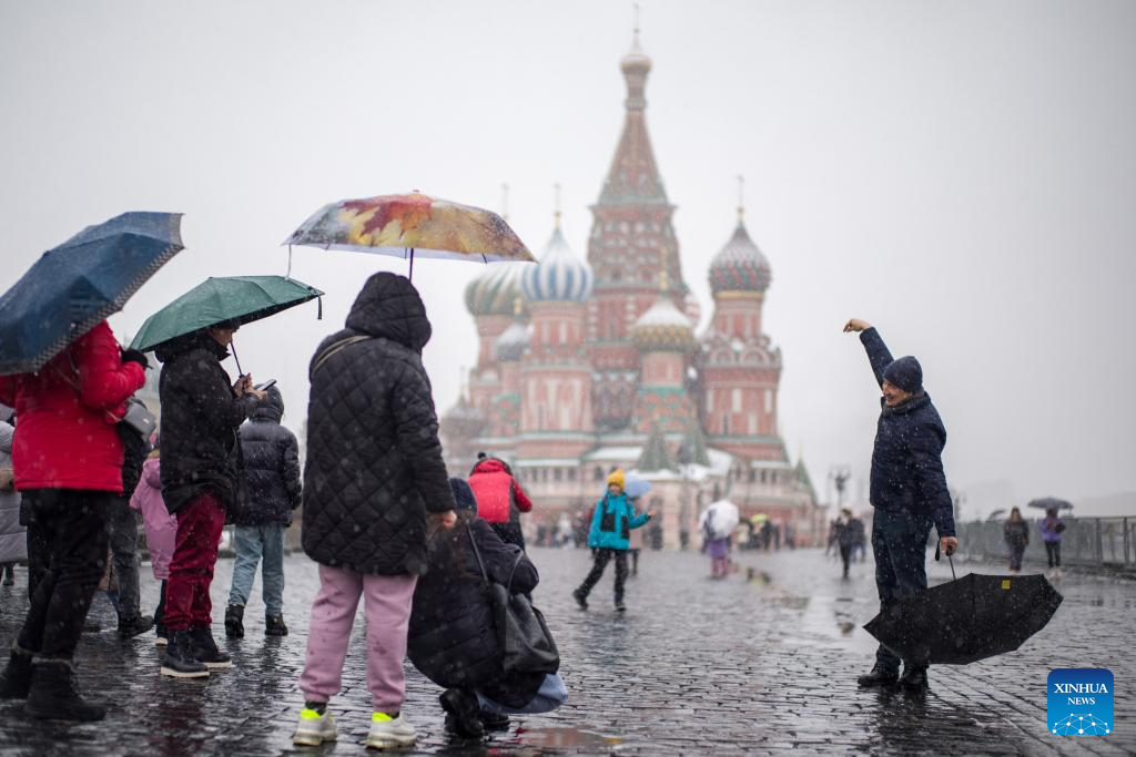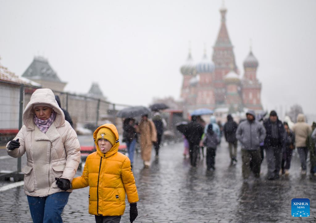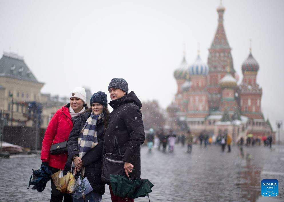 People walk in snow at the Red Square in Moscow, Russia, on Nov. 15, 2025. Moscow on Friday saw its first snowfall since the beginning of winter this year. (Xinhua/Meng Jing)