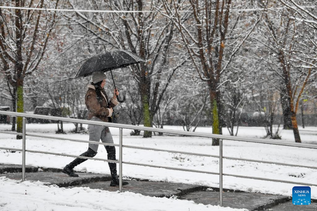A woman walks in snow in Moscow, Russia, on Nov. 15, 2025. Moscow on Friday saw its first snowfall since the beginning of winter this year. (Photo by Alexander Zemlianichenko Jr/Xinhua)