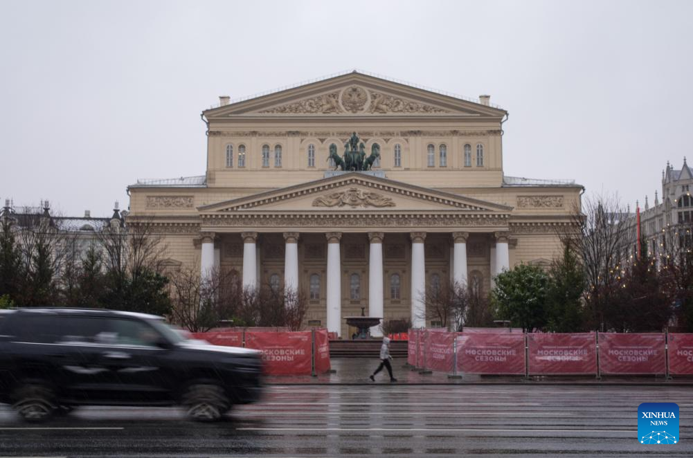 A vehicle passes by the Bolshoi Theatre in snow in Moscow, Russia, on Nov. 15, 2025. Moscow on Friday saw its first snowfall since the beginning of winter this year. (Xinhua/Meng Jing)