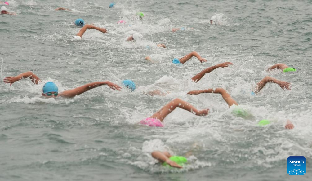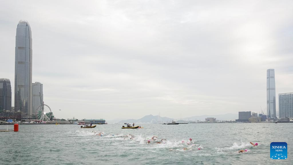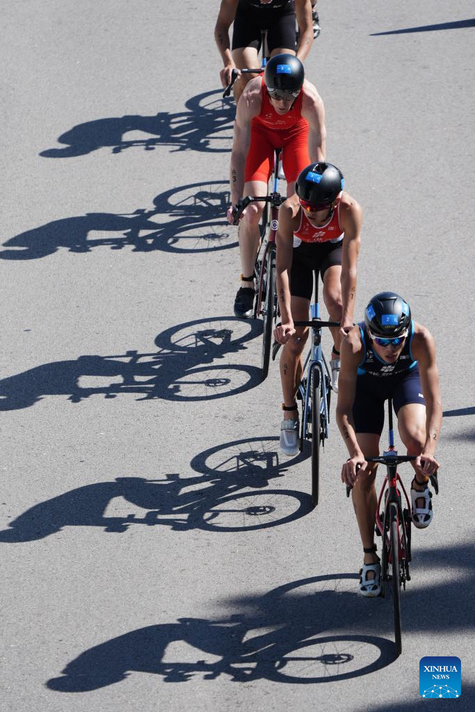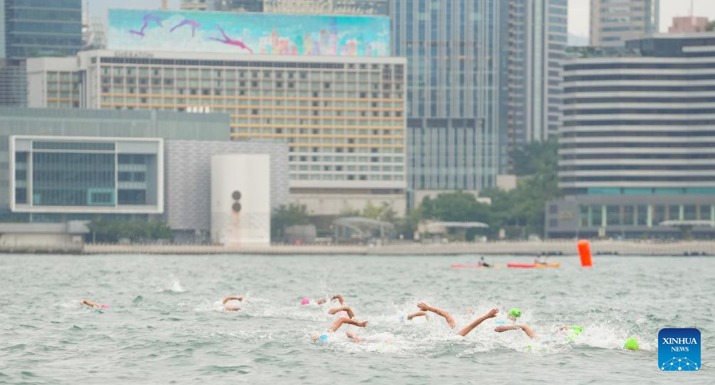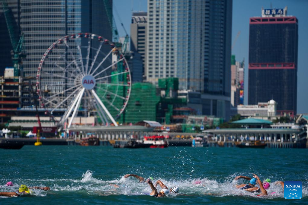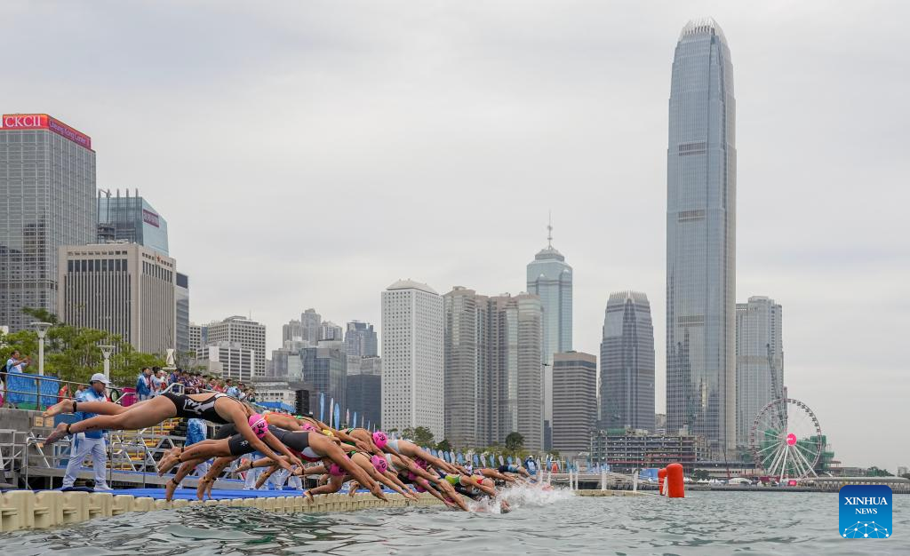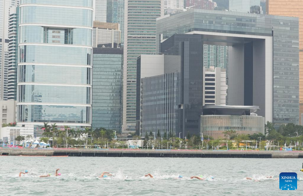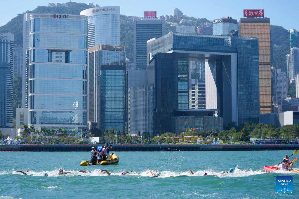 Athletes compete during the women's individual triathlon at China's 15th National Games in Hong Kong, south China, Nov. 15, 2025. (Xinhua/Lui Sui Wai)