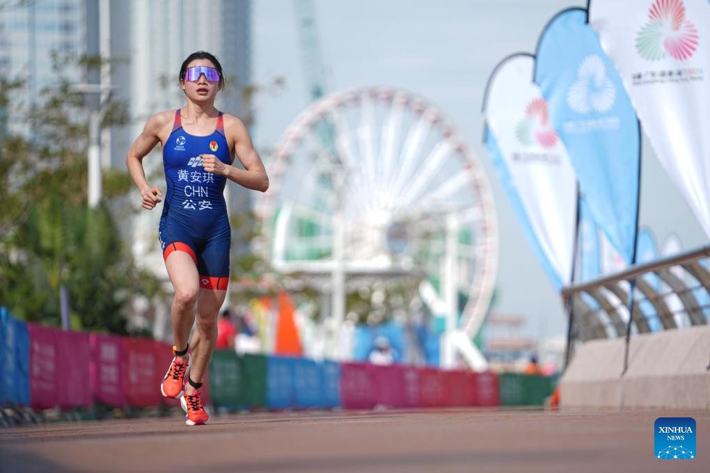 Huang Anqi of Gongan competes during the women's individual triathlon at China's 15th National Games in Hong Kong, south China, Nov. 15, 2025. (Xinhua/Lui Sui Wai)